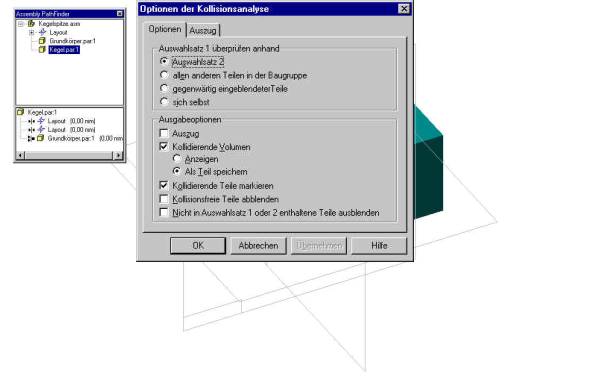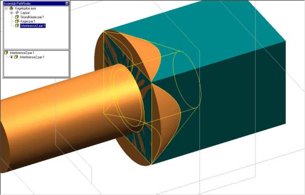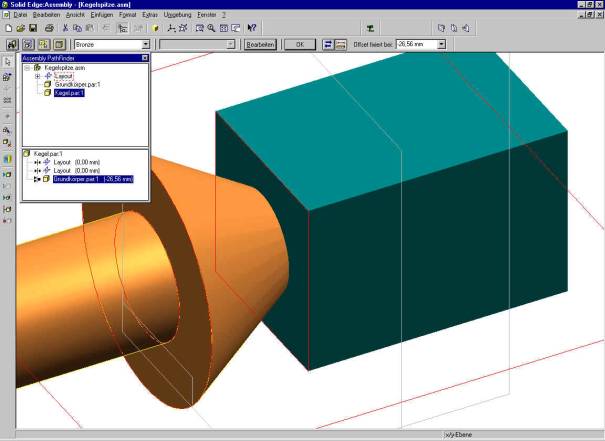 Anschließend können Sie das Volumenelement aus der Baugruppe entfernen. Solid Edge speichert diese Kollisionsvolumenelemente im C:\Temp Verzeichnis. Den ermittelten Wert tragen Sie danach in die Ausrichtbeziehung des Kegels ein. In diesem Falle waren es –26,56 mm.