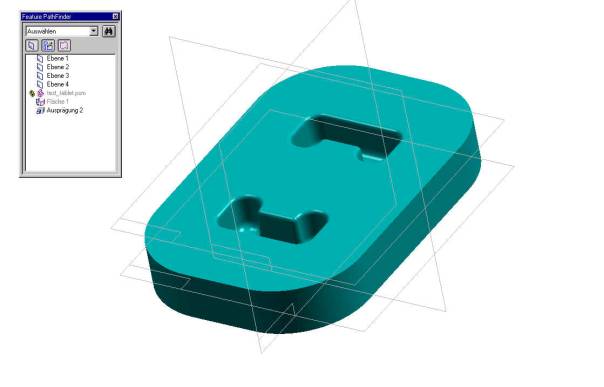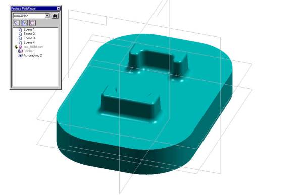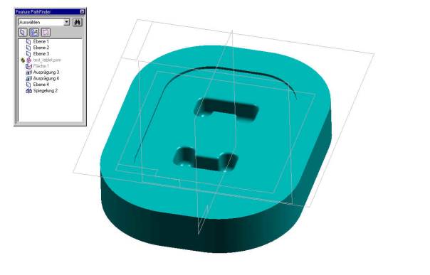 Im nächsten Konstruktionsschritt werden durch Erzeugung einer Ausprägung, unter Berücksichtigung der Blechdicke (parallele Referenzebene im Abstand von 2 mm), die äußeren Abmaße der Matrize ergänzt. Hierbei wird die innere Kontur in der Profilumgebung wieder einbezogen, jedoch nur bis zur Mitte des eingefügten Blechs konstruiert. Die äußeren Konturen sind in diesem Beispiel frei wählbar.